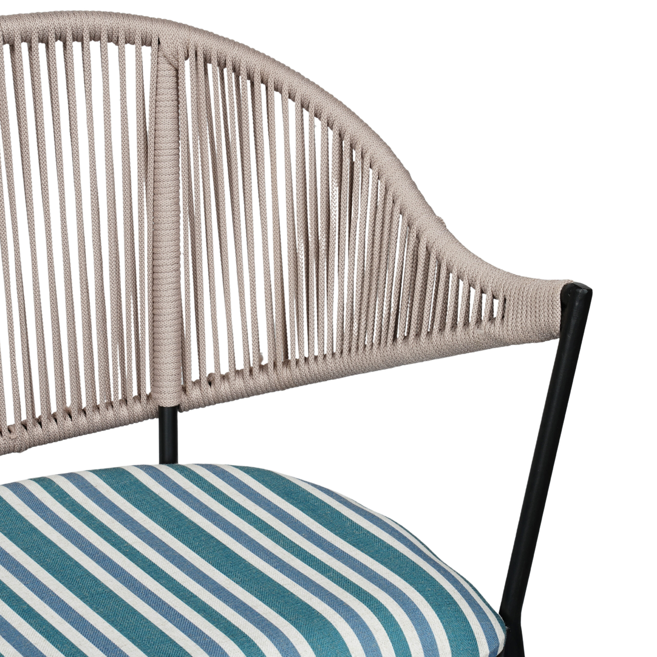 The handwoven rope detailing creates a light, airy look while offering comfortable support, and the cushioned seat enhances relaxation for extended seating. The sturdy powder-coated metal base provides strength and stability, making it ideal for balconies, patios, cafés, dining spaces, and modern living areas.