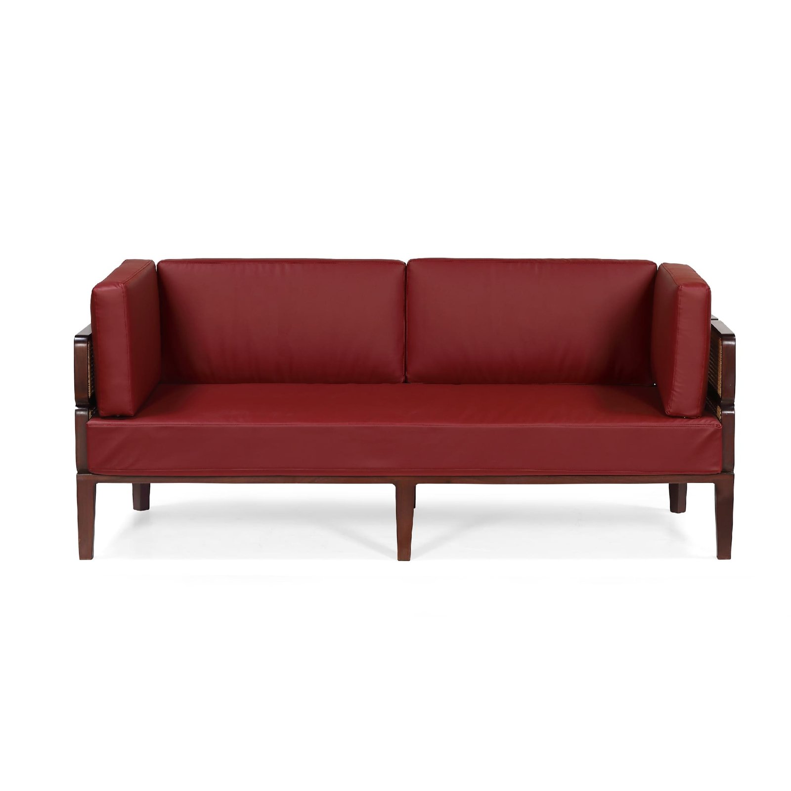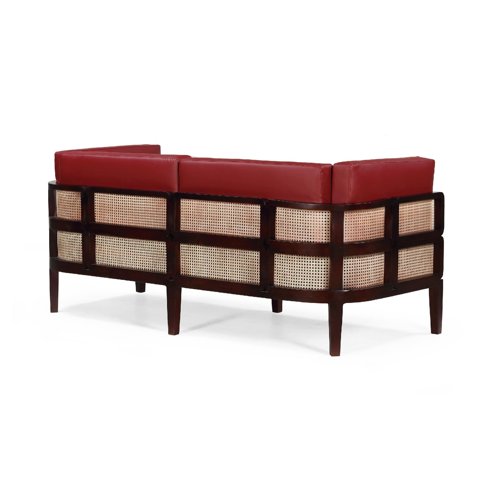 The Derby Three Seater Sofa is a distinguished fusion of craftsmanship and character. Wrapped in rich burgundy leatherette and framed with natural cane accents, it reflects a heritage of timeless artistry reimagined for modern interiors. Its bold silhouette and refined detailing create a perfect balance of luxury and warmth — ideal for sophisticated living and hospitality spaces.