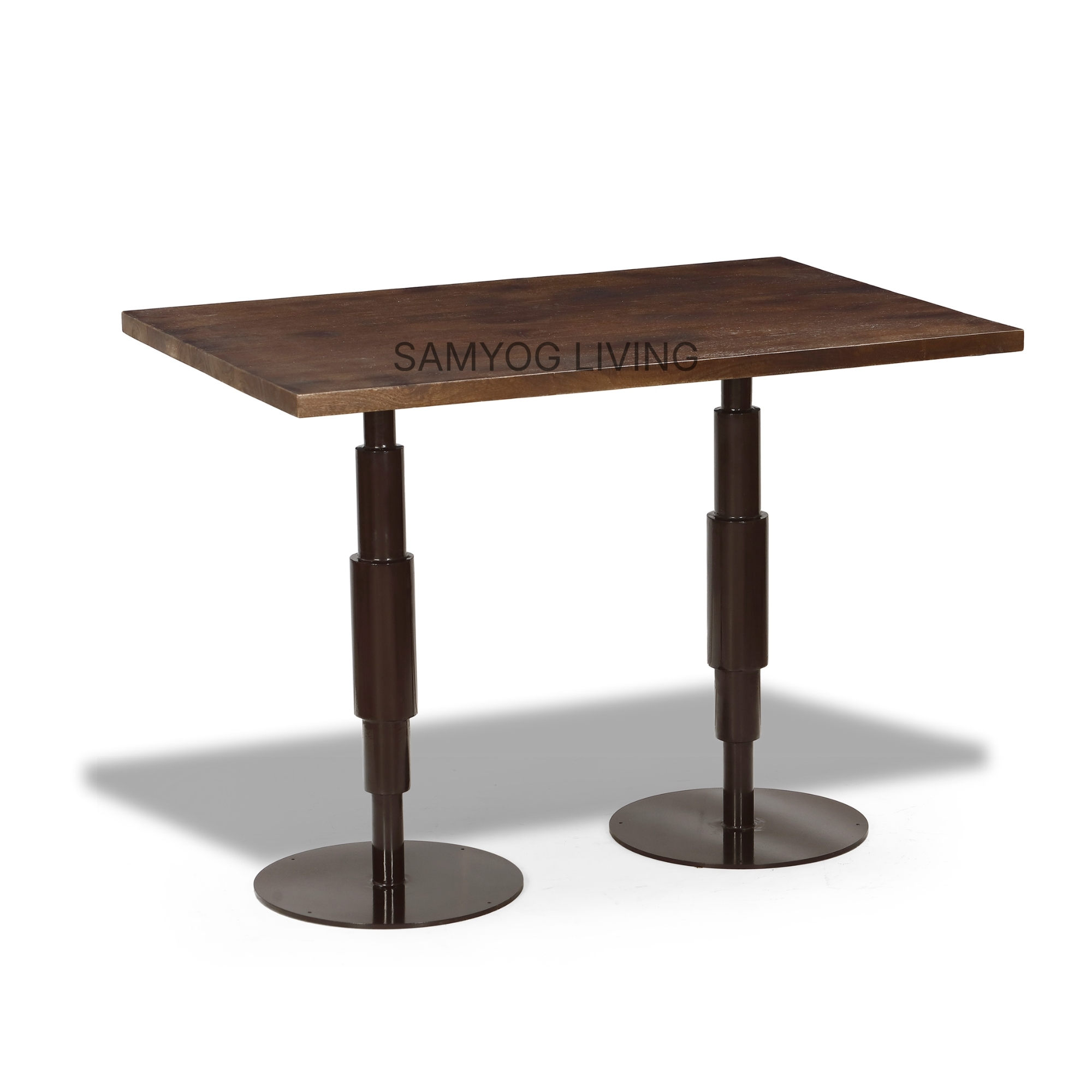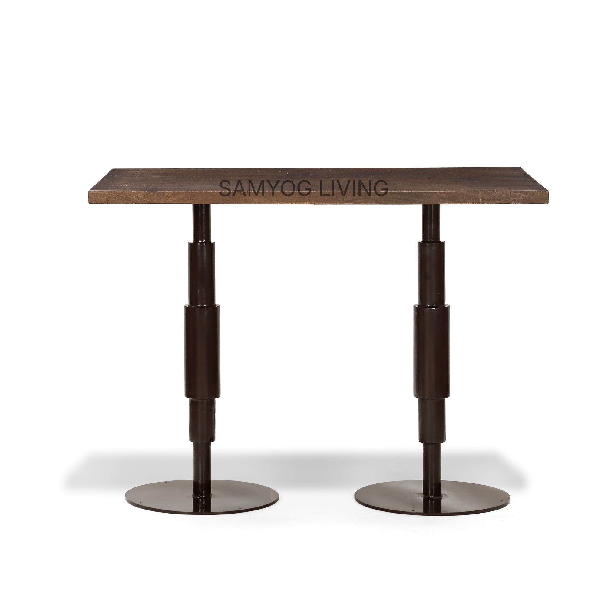 The Taki Rectangle Bar Table brings a refined modern-industrial aesthetic to contemporary bar spaces, cafés, and compact dining environments. Its elongated solid wood tabletop highlights the natural warmth and grain of premium timber, while the dual metal pedestal bases deliver strong visual balance and exceptional stability.