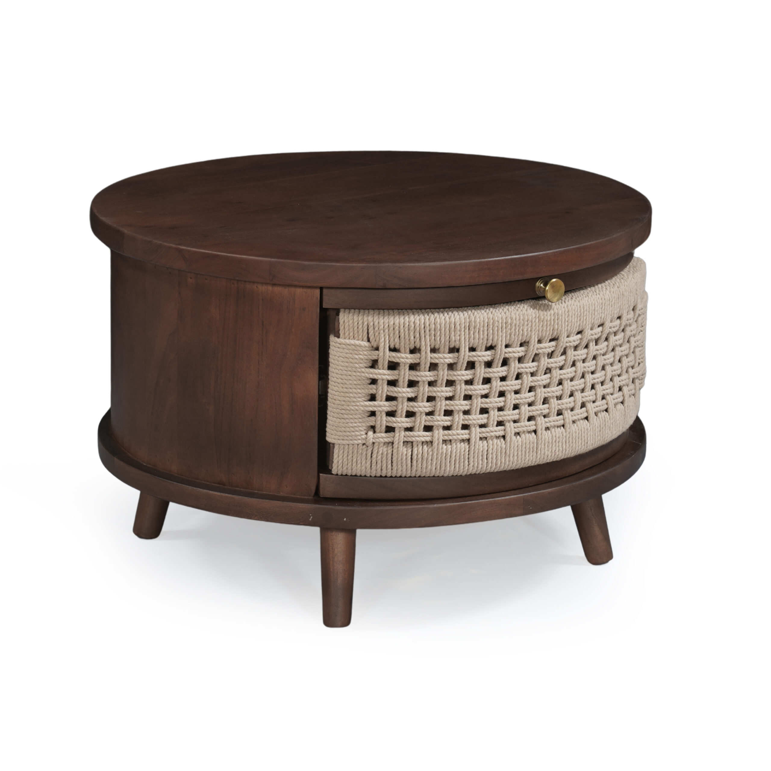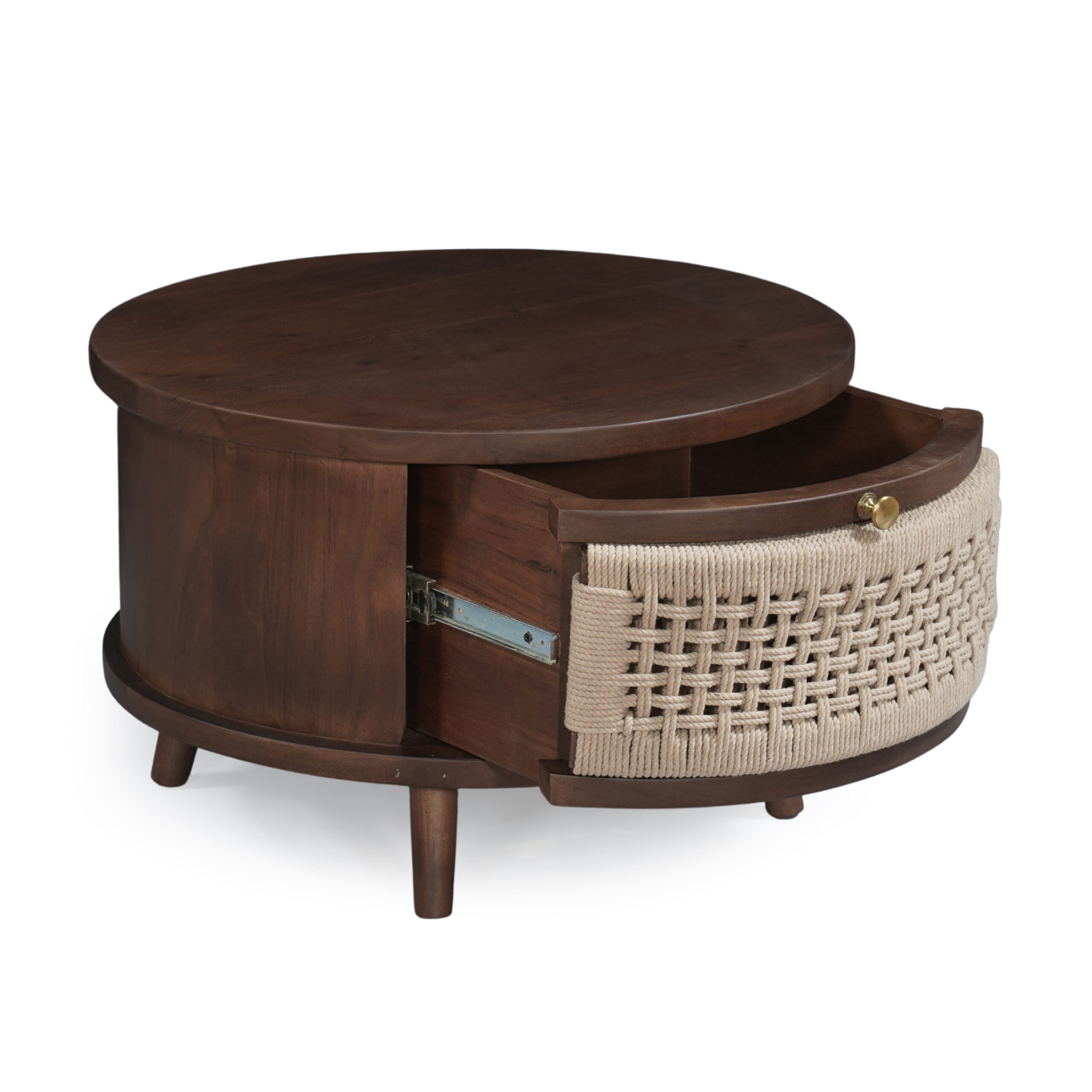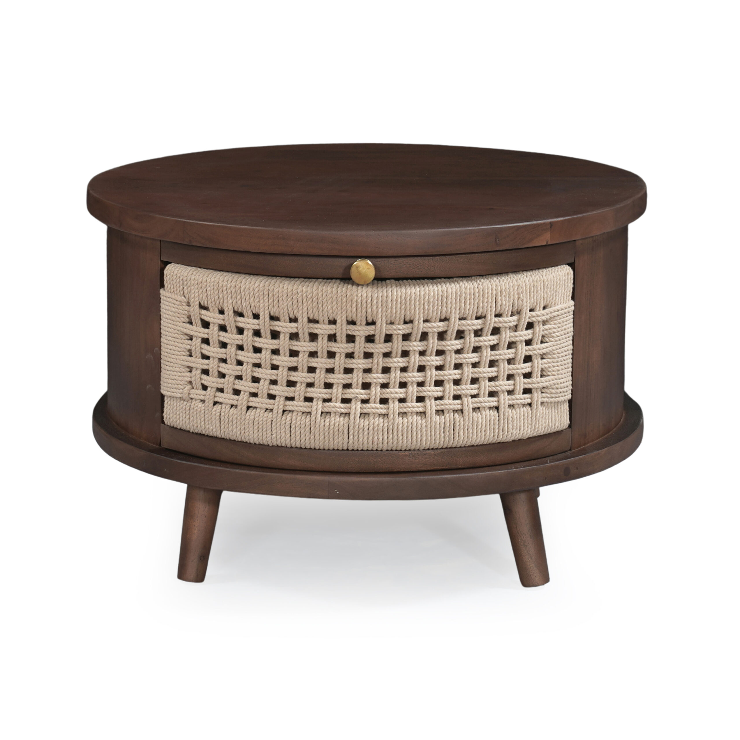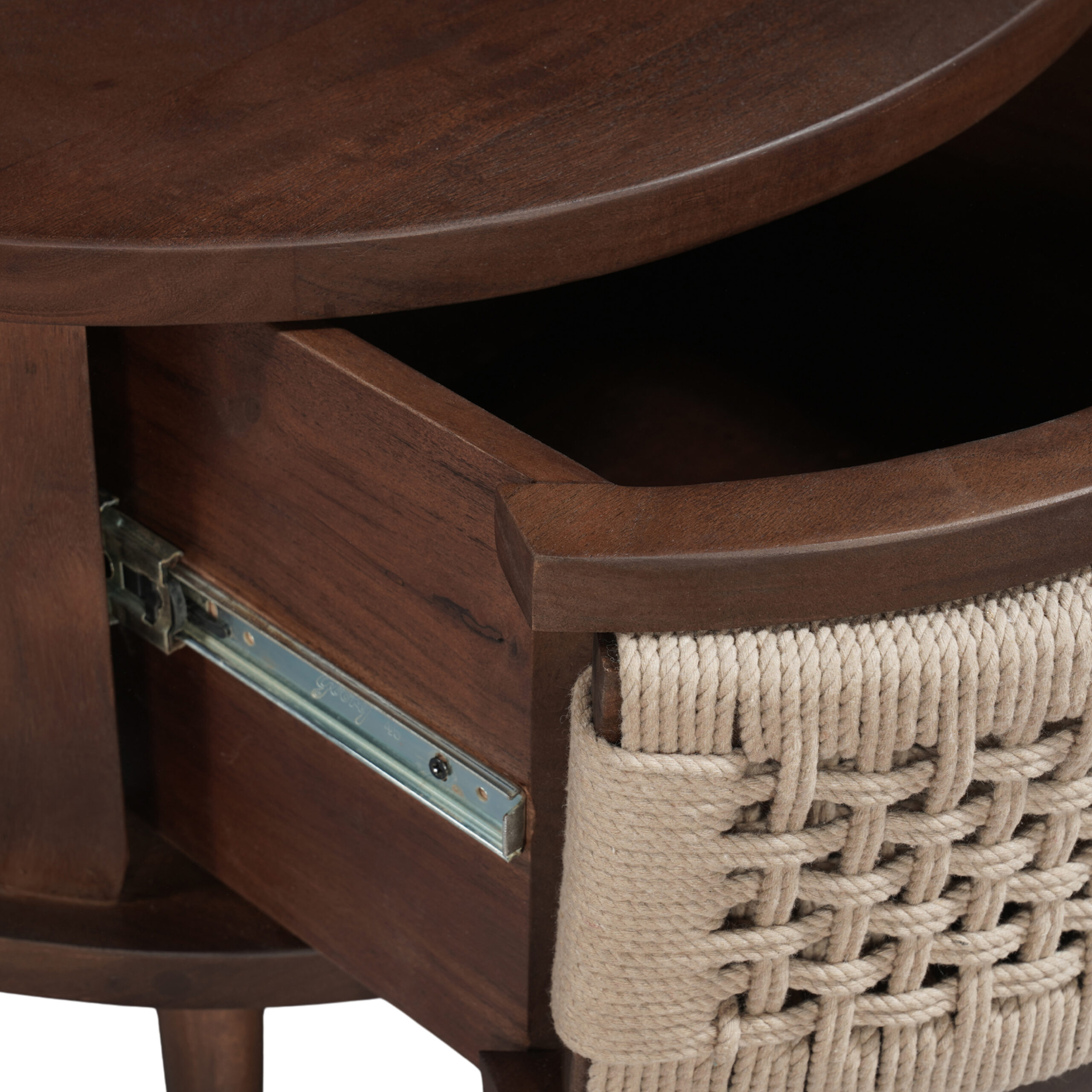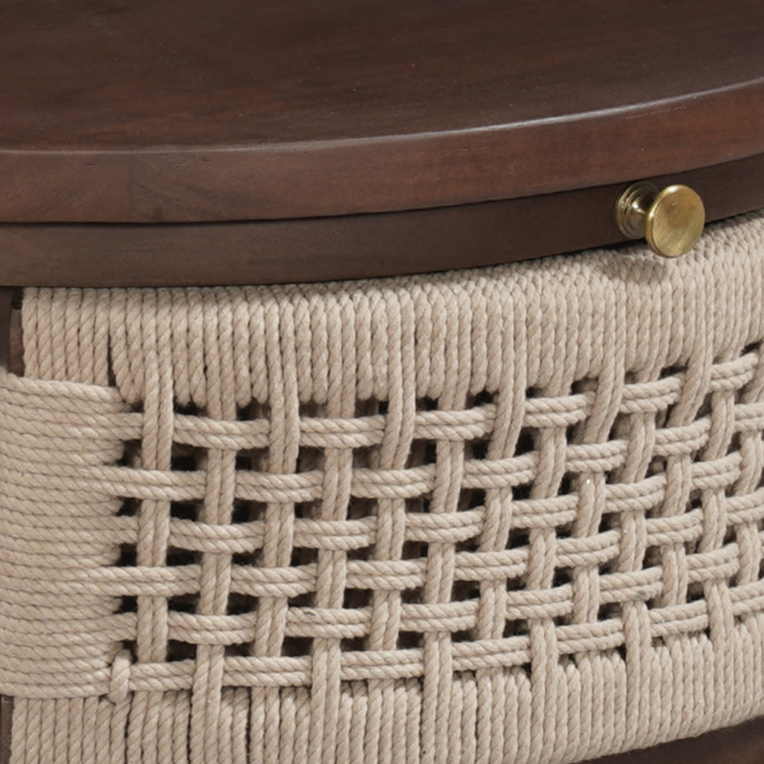 A distinctive woven rope drawer panel adds texture and character while offering practical storage for everyday essentials such as magazines, remotes, or small accessories. The smooth wooden tabletop provides a spacious surface for décor, books, or serving beverages, making it both functional and visually appealing.